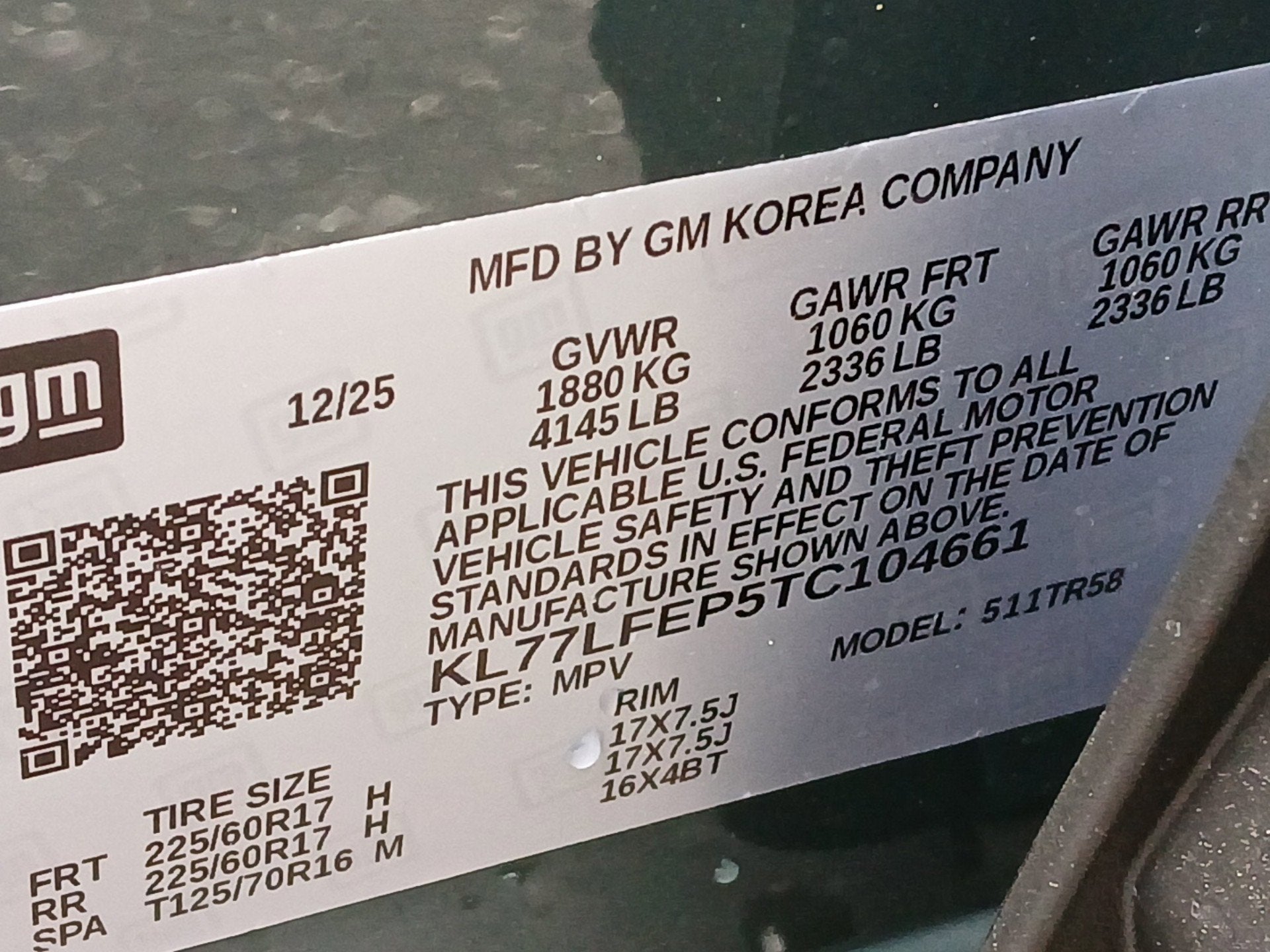 - Tires, 225/60R17 all-season, blackwall